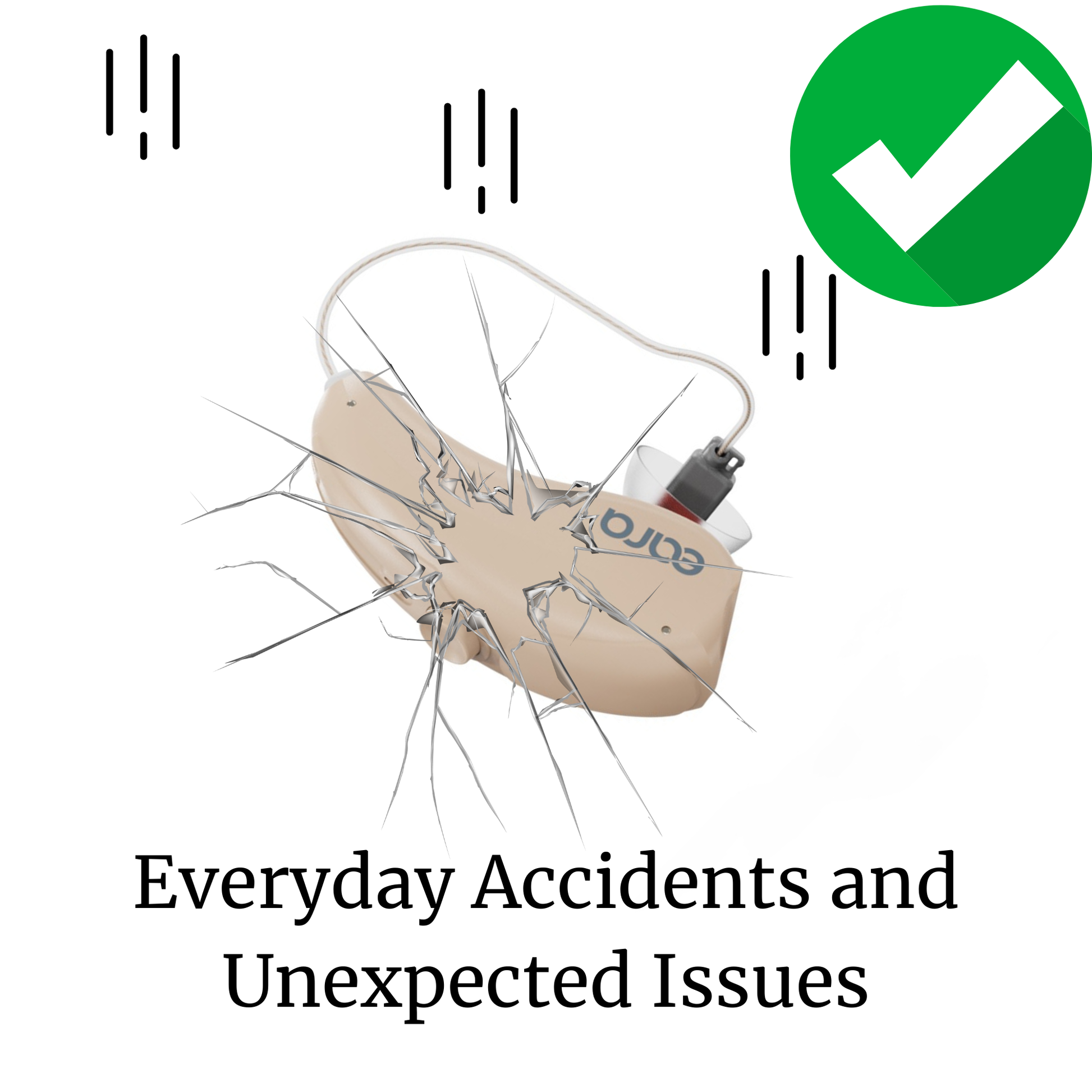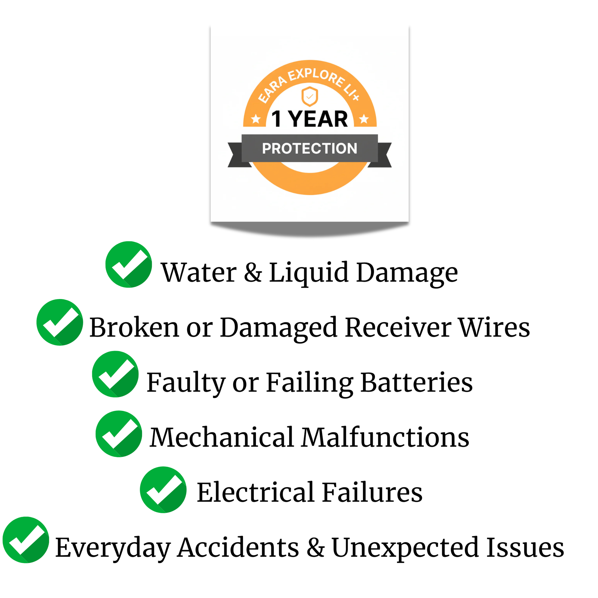 The EARA Protection Plan includes protection: Water & Liquid Damage, Broken or Damaged Receiver Wires, Faulty or Failing Batteries, Mechanical Malfunctions, Electrical Failures, Everyday Accidents & Unexpected Issues